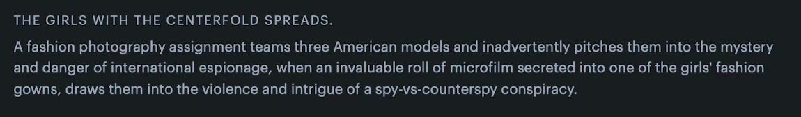 It’s 1975. Cirio H. Santiago’s Cover Girl Models arrives with a whimper. Bearing the mystifying tagline “THE GIRLS WITH THE CENTERFOLD SPREADS,” this sweaty little picture offers audiences pleasures of a more… fleshy variety than those of the old French master: