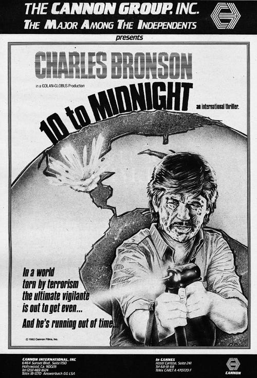 Cannon agreed to make a Charles Bronson feature, but not The Evil that Men Do. They’d figure out exactly what film that would be at a future date, but in the meantime they needed to come up with a placeholder name they could use to pre-sell the movie to foreign territories at Cannes. Golan gave the then-imaginary movie its title, 10 to Midnight, for no other reason than he thought it sounded cool. Under that title they mocked up a crude drawing of Bronson firing an Uzi in front of a globe, called it an “international thriller,” and loosely described a plot that involved an “ultimate vigilante” getting even with terrorists. This as-yet-nonexistent movie sold like hot cakes.
